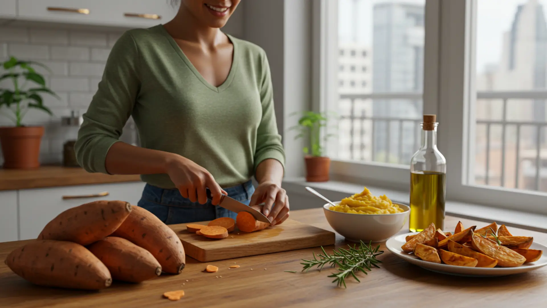 Primeiro, minha receita favorita: batata doce assada com ervas. Lavo uma média, corto em rodelas, tempero com azeite, sal e alecrim, e levo ao forno a 200°C por 25 minutos. Fica crocante e deliciosa. Além disso, é rápido e traz todos os benefícios.